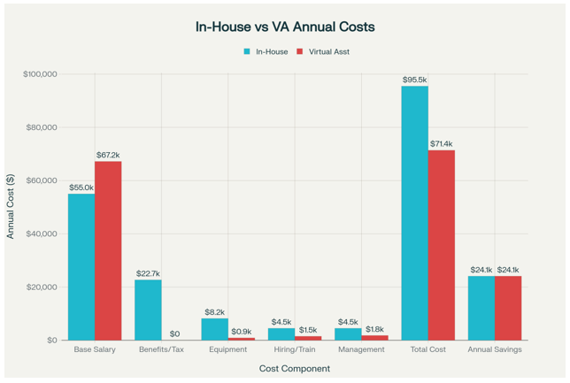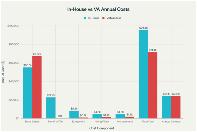 Businesses typically save 30–60% annually by hiring payroll VAs versus employing in-house payroll staff. For a mid-level payroll role, in-house employment costs approximately $95,500 per year (including salary, benefits, taxes, equipment, and management overhead), while a virtual assistant costs around $71,400 annually—delivering $24,100 in savings. Hourly rates for payroll VAs range from $8–$25 per hour depending on experience and location, with monthly retainer packages starting at approximately $999 for general admin support and reaching $2,400+ for executive-level payroll services. Unlike employees, VAs don't receive benefits, vacation pay, or employer-sponsored health insurance, which accounts for most savings.