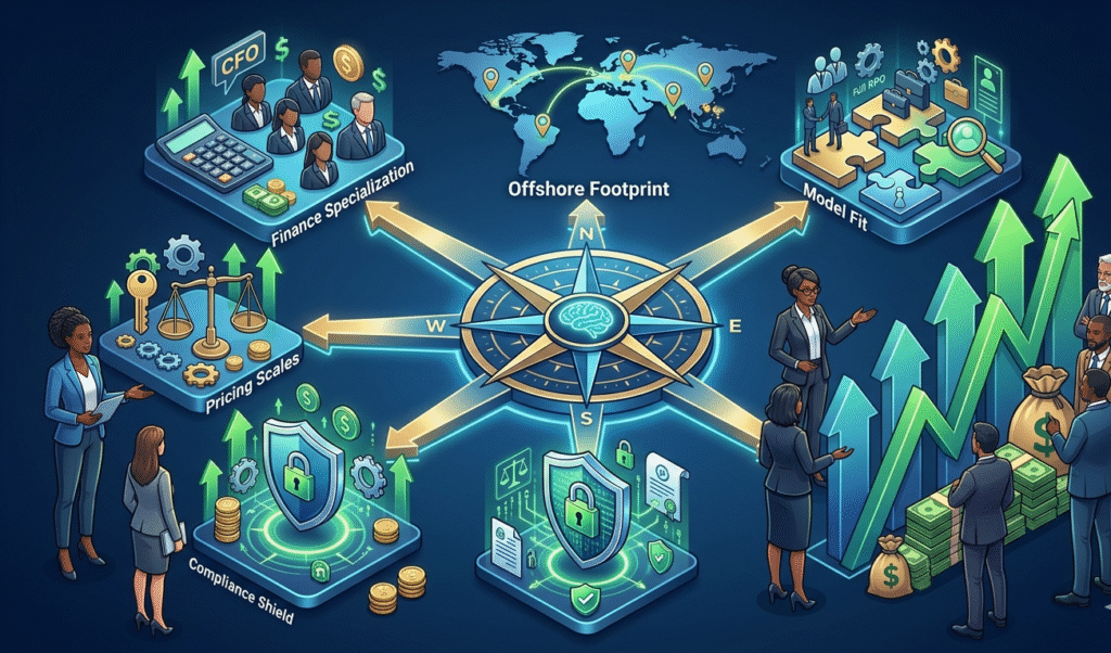 When shortlisting among the top offshore finance recruiters in 2026, finance leaders and talent acquisition teams should evaluate a few practical dimensions: