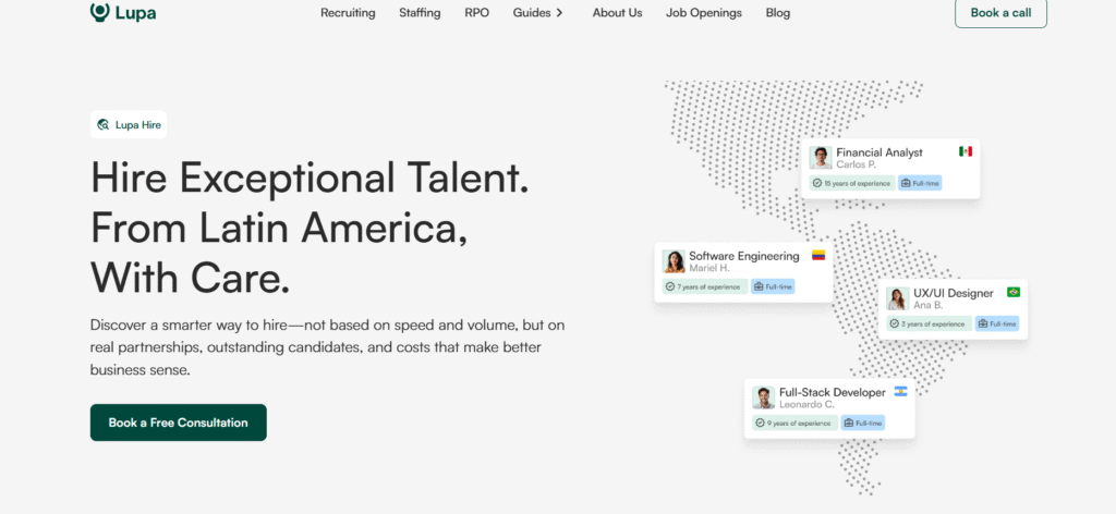 Lupa is a newer but highly specialized finance recruitment solution focused on premium Latin American finance talent for clients in the US and other markets. Rather than positioning as a generic recruiter, Lupa emphasizes “done right” finance hiring with a strong cultural and timezone fit for nearshore teams.