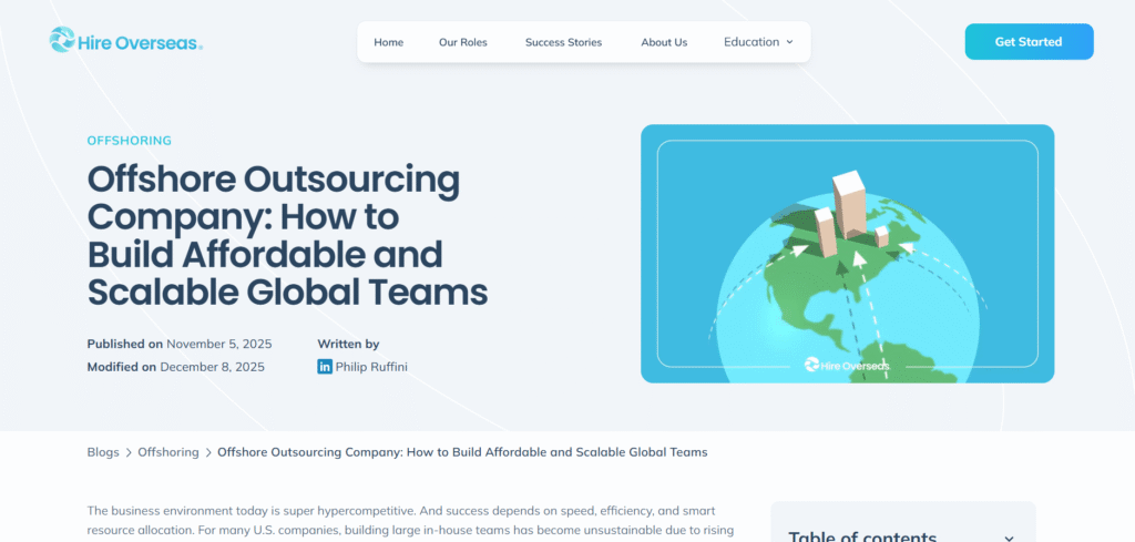 Hire Overseas positions itself as a partner for businesses seeking offshore finance staffing agencies, particularly for accountants, analysts, and finance support roles in markets like the Philippines, South Africa, and Latin America.