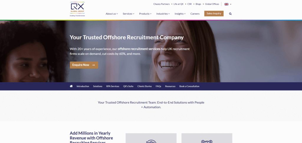 QX positions itself as a long‑term offshore recruitment partner that provides sourcing, screening, compliance, and recruitment back‑office solutions from offshore locations. With more than two decades of recruitment process experience and a large offshore workforce, QX supports UK staffing and recruitment firms in meeting demanding hiring targets and improving margins.