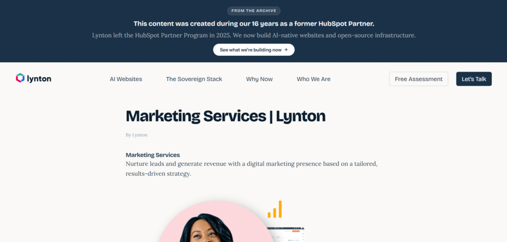 Lynton is particularly effective for organizations using HubSpot as their CRM, as they specialize in aligning sales and marketing through strategic website development. Their services include demand generation through lead nurturing, paid advertising, social media, and website redesign — all deeply integrated.
